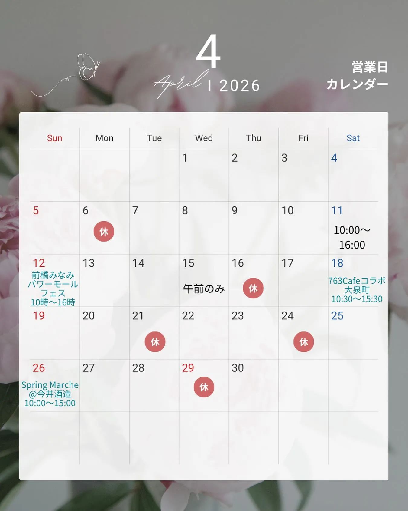 何も書いてない日は通常営業10:00〜22:00(最終受付21:00)です。